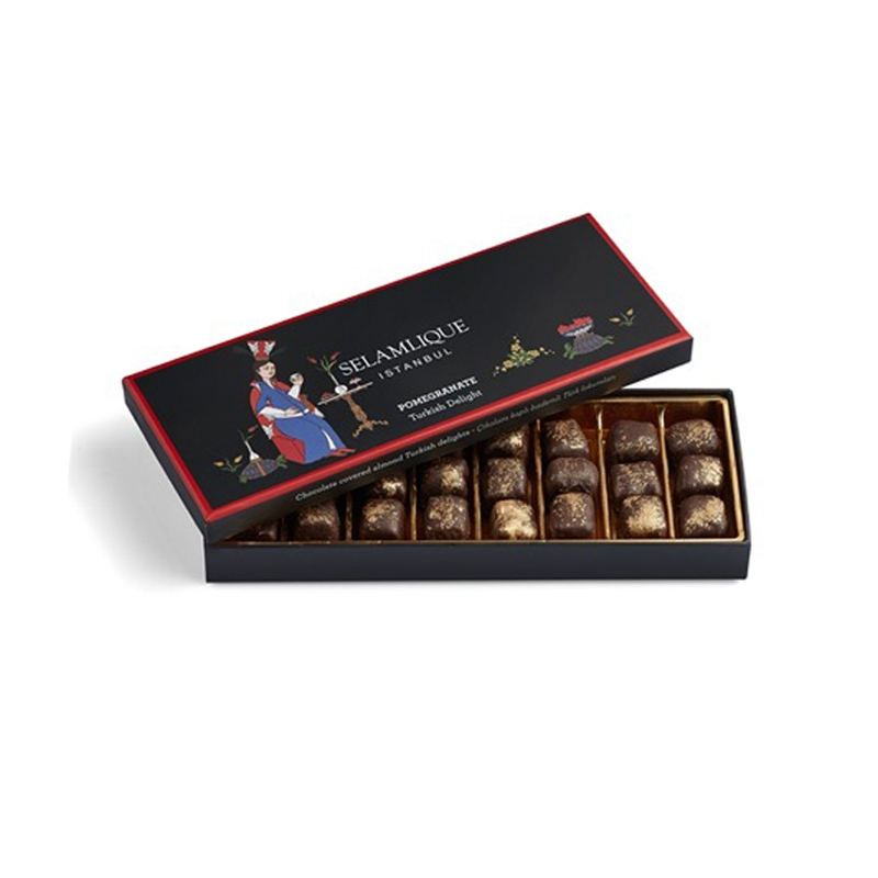 سلامليك بالرمان التركي ديلايت هو متعة لذيذة مصنوعة من أجود أنواع الرمان واللوز والشوكولاتة. إنه مزيج مثالي من الحلو والحامض الذي من المؤكد أن يرضي. الرمان كثير العصير ولذيذ ، ويضيف اللوز قرمشة دقيقة من الجوز. طلاء الشوكولاتة غني ودسم ، ويضيف غبار الذهب الصالح للأكل لمسة من الفخامة. تعد حلوى تركية بالرمان طريقة رائعة لإظهار شخص ما تهتم به أو الاستمتاع به كمتعة شخصية.