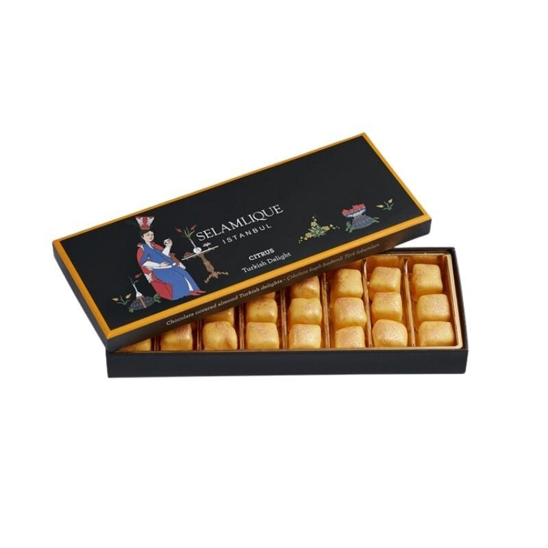 سيلامليك سيتروس ديلايت التركي هي متعة لذيذة مصنوعة من أجود أنواع الحمضيات واللوز والشوكولاتة. إنه مزيج مثالي من الحلو والحامض الذي من المؤكد أن يرضي. الفواكه الحمضية غنية بالنكهة ، ويضيف اللوز قرمشة دقيقة من الجوز. طلاء الشوكولاتة غني ودسم ، ويضيف غبار الذهب الصالح للأكل لمسة من الفخامة. يعد سلامليك حلوى تركية بالحمضيات طريقة رائعة لإظهار شخص تهتم به أو الاستمتاع به كترفيه شخصي.