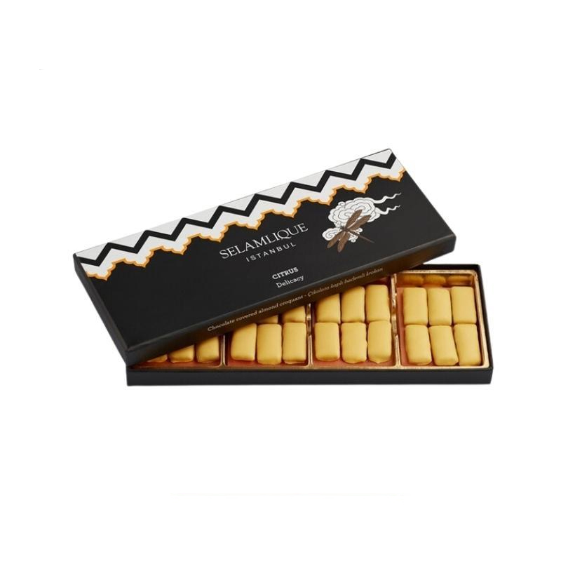 حلوى ديليكاسي بالحمضيات هي حلوى لذيذة مصنوعة من 170 جرام من كروكان اللوز المغطاة بالشوكولاتة. الكروكان مصنوع من اللوز المحمص وقليل من الحمضيات ، والشوكولاتة غنية ودسمة. تعتبر أطباق Selamlique Citrus Delicacy مثالية لمناسبة خاصة أو كمتعة يومية. إنها أيضًا هدية رائعة لمحبي الشوكولاتة.