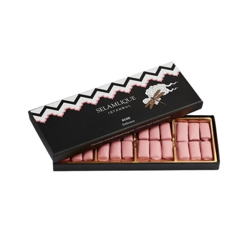 شوكولاتة روز ديليكاسي هي طريقة لذيذة وأنيقة للاستمتاع بتجربة الحلوى التركية التقليدية. هذه الحلوى التركية مصنوعة من مكونات عالية الجودة ، بما في ذلك اللوز المغطى بالشوكولاتة وماء الورد والفستق. يتم رشه بغبار الذهب لإضفاء لمسة فاخرة.