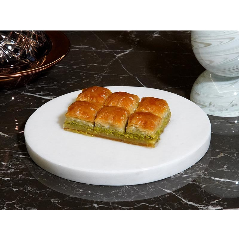 المكون الرئيسي لهذه البقلاوة هو الفستق الفاخر المعروف بنكهته المميزة ولونه الأخضر النابض بالحياة. توفر هذه المكسرات عالية الجودة طعمًا غنيًا وجوزًا ، مما يعزز التجربة الشاملة للبقلاوة.